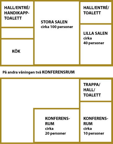 Denna sal, som rymmer ca 100 sittande gäster, är lämplig för större tillställningar såsom konferenser, fester, bröllop, minnesstunder och dopkaffe.